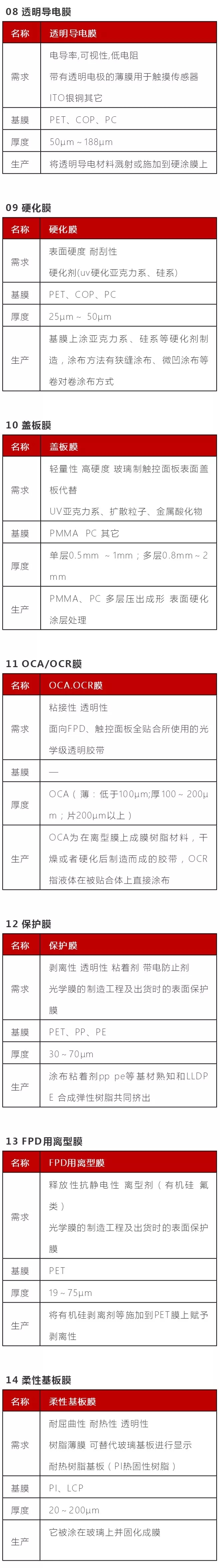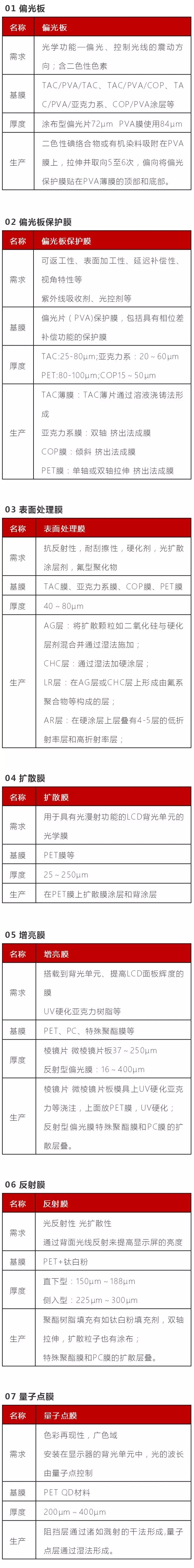 目前,顯示領域涉及薄膜類型主要包含有:偏光板、偏光板保護膜、表面處理膜、 擴散膜、增量膜、反射膜、量子點膜、透明導電膜、硬化膜、蓋板膜、OCA/OCR膜、保護膜、 FPD用離型膜、柔性基板膜等。