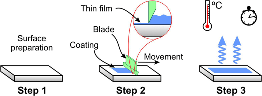 刮刀涂布是一種簡單、低成本可大規(guī)模涂布技術(shù)。其運作原理是通過移動刀片或基板 (substrate),刮涂前驅(qū)體溶液來制備大面積薄膜(如圖3所示)。其最大的優(yōu)勢為僅需極少量的前驅(qū)體溶液,改進了旋轉(zhuǎn)涂布法中浪費大量溶液的缺點。原則上,所制備的薄膜厚度可透過調(diào)整前驅(qū)體溶液濃度、刀片的移動速度、基板的性質(zhì)以及刀片與基板之間的距離來控制。