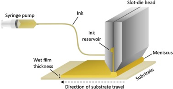 狹縫涂布法已廣泛應(yīng)用于連續(xù)大規(guī)模涂布制程,是非常適合卷對卷制程的涂布技術(shù)。狹縫涂布裝置包含兩個獨立的可移動刀片,兩刀片之間的間隙構(gòu)成一個狹縫,可供墨和進行流量控制(如圖4所示)。與刮刀涂層法相似,薄膜厚度可以透過調(diào)整前驅(qū)體溶液濃度、基板的性質(zhì)和刀片與基板之間的距離來控制,而油墨特性 (黏度和濃度)、抽墨噴涂速度、基材移動速度和刀片之間的狹縫尺寸也是薄膜性質(zhì)的可控件。因此,狹縫涂布法目前普遍被認(rèn)為是最適合工業(yè)大規(guī)模生產(chǎn)的涂布技術(shù)。