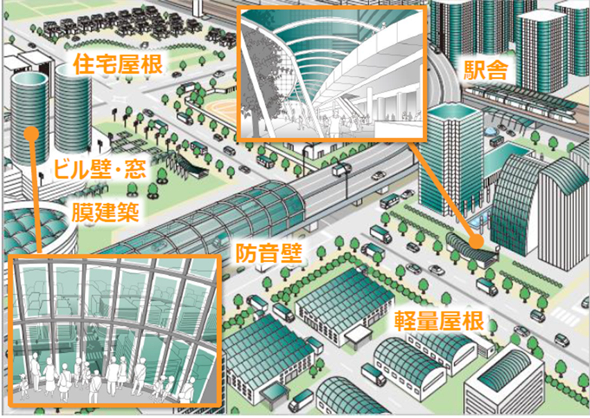 日本東芝公司在其薄膜型太陽能電池的應(yīng)用規(guī)劃,預(yù)計透過在城市地區(qū)大規(guī)模安裝薄膜型太陽能電池等擴大再生能源發(fā)電如圖8所示。