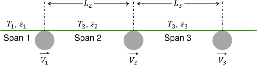 圖2 多跨段卷對卷(R2R)生產(chǎn)線中的應(yīng)變傳輸(Ti和εi分別表示第i個(gè)卷材跨段的卷材張力和應(yīng)變,Vi表示第i個(gè)跨段末端的卷材縱向速度,Li表示第i個(gè)跨段的長度,其中i=1–3)02